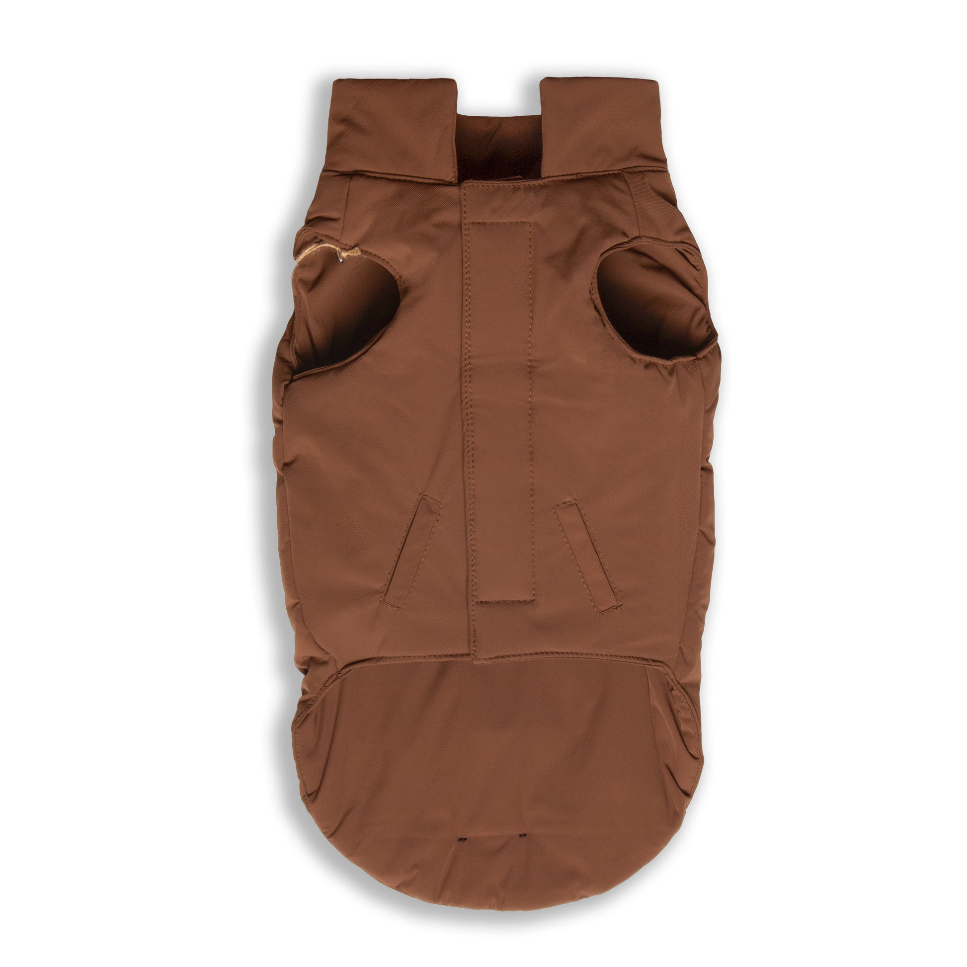Su cuello alto estructurado aporta un aire distinguido y protege del viento, mientras que el ojal discreto en la espalda permite el paso de la pechera sin comprometer el estilo. El sistema de cierre en velcro, cuidadosamente oculto, garantiza un ajuste perfecto y práctico.