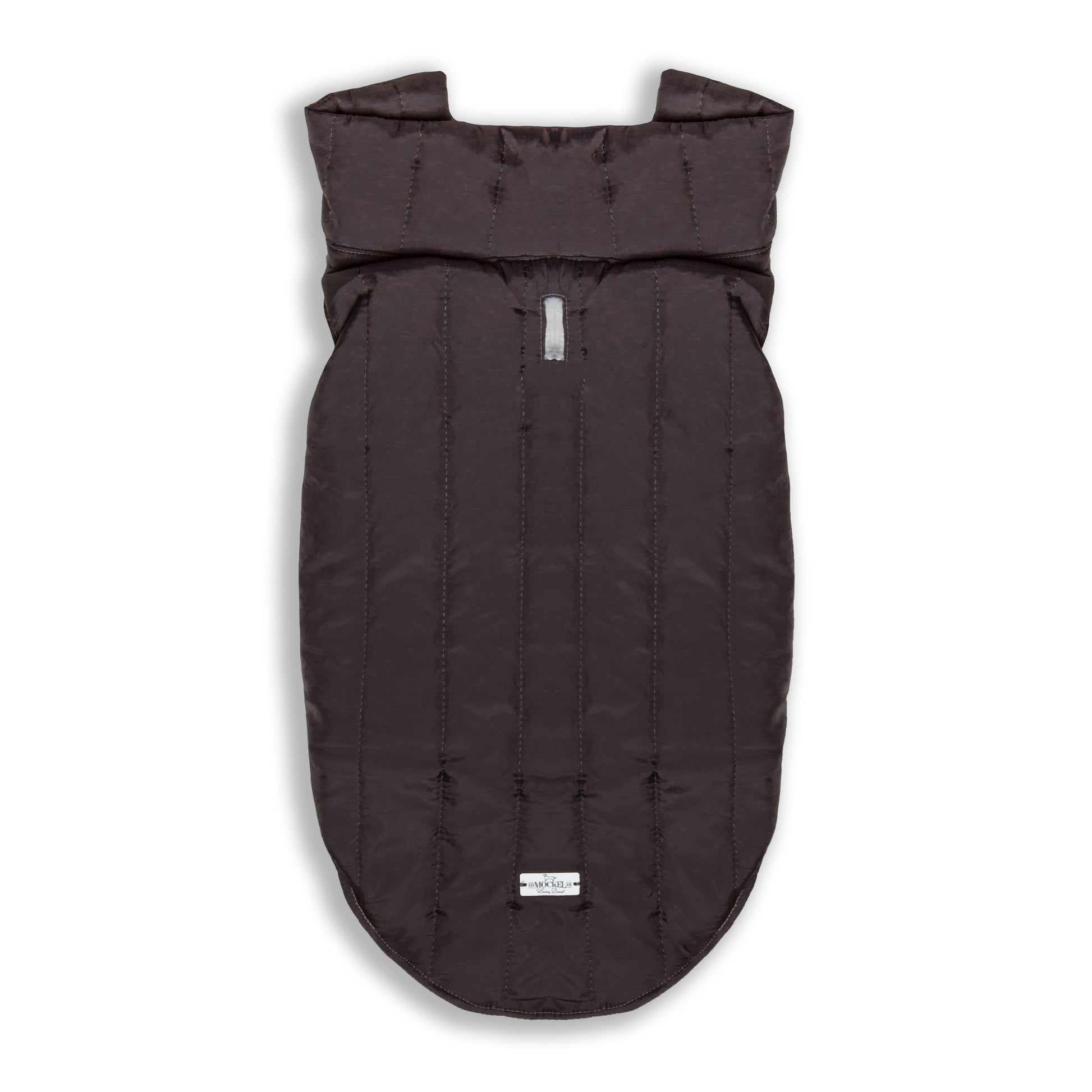 Su cuello alto estructurado aporta un aire distinguido y protege del viento, mientras que el ojal discreto en la espalda permite el paso de la pechera sin comprometer el estilo. El sistema de cierre en velcro, cuidadosamente oculto, garantiza un ajuste perfecto y práctico.